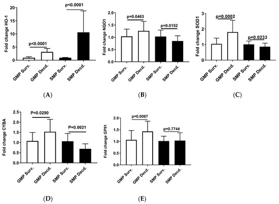 Real-time PCR analysis of Nrf2 target genes in heart cDNA prepared from irradiated survivor and decedent GMP/SMP. (A–E) Normalized quantitative PCR analysis showing the fold change in the expression of HO-1, NQO1, SOD1, CYBA, and GP91 in the hearts of irradiated survivor or decedent GMP/SMP. The y-axis represents the fold changes in expression of decedent animals genes compared with the survivors.