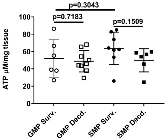 Heart ATP levels in irradiated survivor and decedent GMP/SMP. Graph representing the ATP levels measured in heart lysates of irradiated survivor or decedent SMP/GMP. Each circle or square in the graph represents measurements from one individual animal.