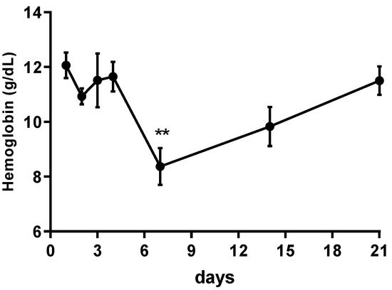 Hemoglobin levels during gemfibrozil treatment. The panel shows the hemoglobin levels at 7 different times over 21 days in WT mice. Data are presented as mean ± SEM; n = 6. One-way ANOVA) followed by Dunnett’s post hoc test. ** p < 0.01.