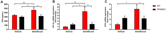 Hypoxia-inducible factor (HIF) is a transcription factor that responds under low oxygen availability [16]. HIF-2α is the main regulator of erythropoietin production [17]. Gemfibrozil-treated mice presented increased levels of HIF-2α and EPO mRNA in the renal tissue (Figure 2B,C), while PPAR-α deletion blunted this increase (Figure 2B,C).