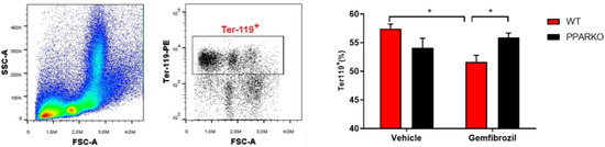 Gemfibrozil treatment decreased erythroid cells, and PPAR-alpha deletion blunted it. Ter-119+ is an erythroid marker. Gating strategy for Ter-119+ and quantification are presented. Data presented as mean ± SEM; n = 5–6 per group. Two-way ANOVA followed by Tukey’s post hoc test. * p < 0.05.