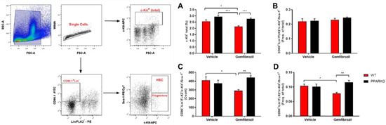 Bone marrow is the primary hematopoiesis site; it is where all blood and immune cells are formed. TER-119 is an erythroid-specific marker expressed at all differentiation stages, from early proerythroblasts to mature erythrocytes [18]. Gemfibrozil decreased the percentage of TER-119 in the bone marrow, while PPAR-alpha-knockout mice maintained this percentage at a level similar to that of vehicle-treated WT mice, increasing the percentage compared to WT gemfibrozil (Figure 3). Hematopoietic stem cells (HSCs) were defined as Lin-FLK-2-Sca-1+c-Kit+Thy1.1low [19]. Gemfibrozil treatment diminished HSC counts, while PPAR-alpha deletion was capable of reversing this reduction in the bone marrow (Figure 4A–D).
