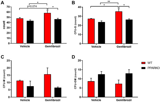 It was found that gemfibrozil increased total colony-forming-unit (CFU) counts, while PPAR-α deletion kept CFU counts at the same levels as those observed in the vehicle group of WT mice (Figure 5A). We also found differences in granulocyte colony-forming units: gemfibrozil increased their counts and PPAR-α-knockout mice showed no changes (Figure 5B), maintaining the same levels as those of vehicle-treated WT mice. No differences were found in monocyte colony-forming units or colony-forming units of granulocyte-macrophage progenitor cells (Figure 5C,D).