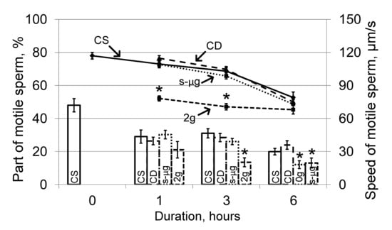 Cultivation of sperm in the medium led to a decrease in the number of motile spermatozoa and a decrease in the speed of movement in the static control group relative to the zero control group. The proportion of motile spermatozoa was 29 ± 4% in the CS1 group, 31.0 ± 2.8% in the CS3 group, 19.9 ± 2.0% in the CS6 group and 48 ± 4% in the CS0 group (histogram, Figure 1). The speed of movement after 1 and 3 h did not significantly differ from that at the zero point (CS1, 109.5 ± 2.4 μm/s; CS3, 103 ± 3 μm/s; compared to 117 ± 3 μm/s in CS0). After 6 h, the speed significantly decreased by 32% (p < 0.05) and was 79 ± 5 μm/s in the CS6 group (Figure 1, graph). The motility parameters in the dynamic control groups did not differ from those in the corresponding static control groups; therefore, the motility parameters in the s-μg and 2g groups were compared with those in the corresponding static control groups.