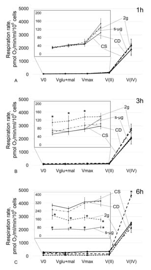 Absorption rate of oxygen by sperm after cultivation under simulated microgravity and hypergravity conditions. (A)—cultivation for 1 h; (B)—cultivation for 3 h; (C)—cultivation for 6 h. CS—static control, CD—dynamic control, s-μg—simulated microgravity conditions, 2g—hypergravity conditions. V0—respiration rate of permeabilized cells; Vglu+mal—respiration rate after addition of 10 mM glutamate + 5 mM malate; Vmax—maximum respiration rate after addition of 2 mM ADP; V(II)—respiration rate after addition of 0.5 mM rotenone (complex I inhibitor) and then 10 mM succinate (substrate of complex II); V(IV)—respiration rate after addition of 5 mM antimycin (complex III inhibitor) and then 0.5 mM TMPD + 2 mM ascorbate (artificial substrates of complex IV). The change in respiration rate from V0 to V(II) in increased resolution is presented on the graphs in the frame. * p < 0.05 compared with the corresponding static control group. The data are presented as the mean ± standard error of the mean (M ± SE).