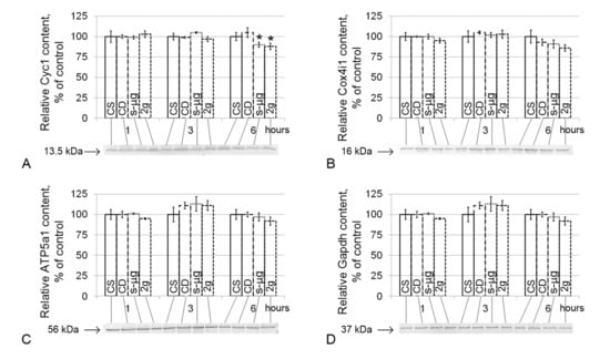 The relative content of cytochrome c-1 (Cyc1) slightly, although significantly, decreased in the simulated micro- and hypergravity conditions after 6 h by 10% in the s-μg6 group (p < 0.05) and by 12% in the 2g6 group (p < 0.05) compared with the CS6 group (Figure 3A). The contents of cytochrome c oxidase (Cox4i1), ATP synthase F1 (ATP5a1) and glyceraldehyde-3-phosphate dehydrogenase (Gapdh) did not differ from the corresponding control levels either under simulated microgravity or hypergravity conditions (Figure 3B–D).