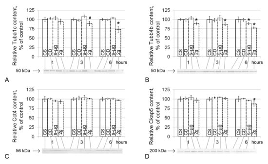 The relative content of alpha-tubulin (Tuba1c) did not differ among the CS, CD and s-μg groups (Figure 4A), and in group 2g, it decreased by 11% after 3 h (p < 0.1) and by 27% after 6 h (p < 0.05). The content of the second microtubule component, beta-tubulin (Tubb4b), in the 0g group decreased by 13% (p < 0.05) after 6 h (Figure 4B). However, in the 2g group, a significant decrease in the relative content of Tubb4b was noted after 1 h (by 11%, p < 0.05), after 3 h (by 13%, p < 0.05) and after 6 h (by 23%, p < 0.05).