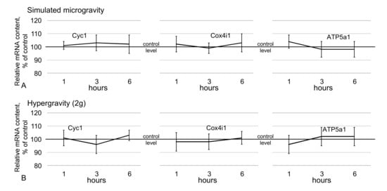 In addition to the protein content, the relative mRNA content of genes encoding proteins involved in cell respiration (cytochrome c-1, cytochrome c oxidase, ATP synthase F1) did not differ from the control level up to 6 h of exposure in simulated microgravity (Figure 5A) and hypergravity conditions (Figure 5B).