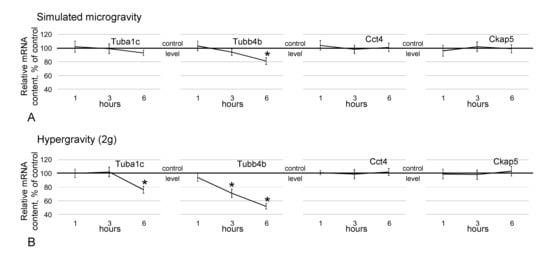 The relative Tuba1c mRNA level did not differ between the CS, CD and s-μg groups, but in the 2g group, it decreased by 24% (p < 0.05) after 6 h compared with the corresponding control level (Figure 6B). The content of Tubb4b under simulated microgravity conditions decreased after 6 h by 19% (p < 0.05) compared with the control level (Figure 6A); under hypergravity conditions, after 3 h, the level was decreased by 29% (p < 0.05), and after 6 h, it was decreased by 48% (p < 0.05) relative to the control level (Figure 6B). The relative mRNA levels of Cct4 and Ckap5 did not change among the CS, CD, s-μg and 2g groups (Figure 6) up to 6 h of exposure.