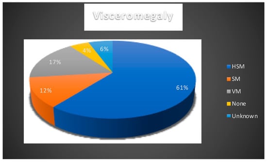 Presence of visceromegaly reported in NPC1 cases. HSM: hepatosplenomegaly, VM: visceromegaly, SM: splenomegaly. Blue: hepatomegaly; orange: splenomegaly; grey: visceromegaly; yellow: none; light blue: unknown