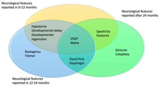 Descriptions of these 43 patients had varying degrees of detail regarding the neurological progression of the disease. Age distribution of neurological symptoms and signs is shown in Figure 4. In 7/43 patients, additional symptoms were described in the first 24 months of life: VSGP in five cases, ataxia, dysphagia, and dysarthria in one case and one patient was described to display both ataxia and cataplexy. Most additional symptoms were described to have occurred after 24 months of age.