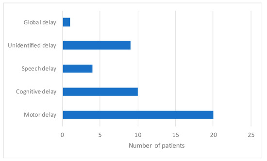 Dysphagia and swallowing difficulties were reported in 9/43 patients between the ages of 13 and 60 months. A total of 8/43 patients developed seizures between the ages of 30 and 70 months. Ataxia/abnormal gait was described in 5/43 patients during the follow-up. A total of 4/5 patients with ataxia were also reported to have dysarthria. Dystonia was described in 5/43 cases and spasticity in 4/43.