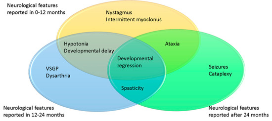 In the majority of patients, neurological symptoms start insidiously after a varying period of normal or slightly delayed development. While initial symptoms are often nonspecific such as hypotonia, developmental delay, and clumsiness, regression gradually occurs with patients experiencing loss of motor skills and cognitive decline [1,17,30]. Vertical supranuclear gaze palsy, cataplexy, or drop attacks could occur early in the presentation of NPC. Ataxia, dysphagia, dysarthria, and loss of cognitive skills demonstrate progression of the disease and psychiatric symptoms are typical in adult patients [4,31,32,33]. Patients with early onset NPC have a more severe and rapidly progressing course than those with later onset of neurological disease [1,12,27,34,35].