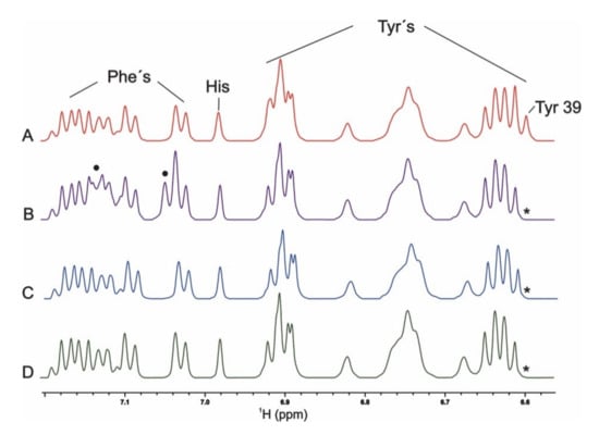 1H NMR of aromatic side chains of the position-39 αS proteins. Spectra were registered at 15 °C in Buffer A of samples containing 100 µM wt (A), Y39F (B), Y39A (C), and Y39L αS (D). Asterisks indicate the lack of peaks corresponding to the Tyr-39 residue. Circles indicate the detection of new signals assigned to the Phe residue in position 39.
