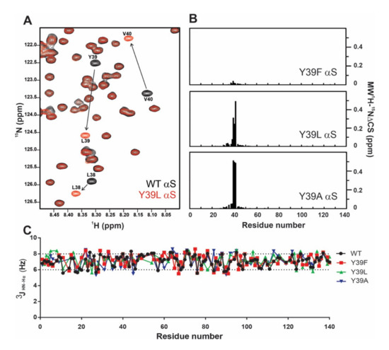 Changes induced by the mutations are only local and restricted to the immediate vicinity of the position-39 residue. (A) Overlaid contour plots of 1H-15N heteronuclear single quantum correlation (HSQC) spectra of 50 µM wt (black) and Y39L αS (red). Most affected residues located in the vicinity of the mutated site are labeled. (B) Differences in the mean weighted chemical shifts (MW 1H-15N ΔCS) displacements between wt and Y39F, Y39A, and Y39L αS mutants. (C) Panel shows the 3JHN-Hα profiles measured for the wt and Y39F, Y39A, and Y39L αS proteins. In all cases, experiments were recorded at 15 °C using 15N isotopically enriched protein samples (50 µM) dissolved in Buffer A.