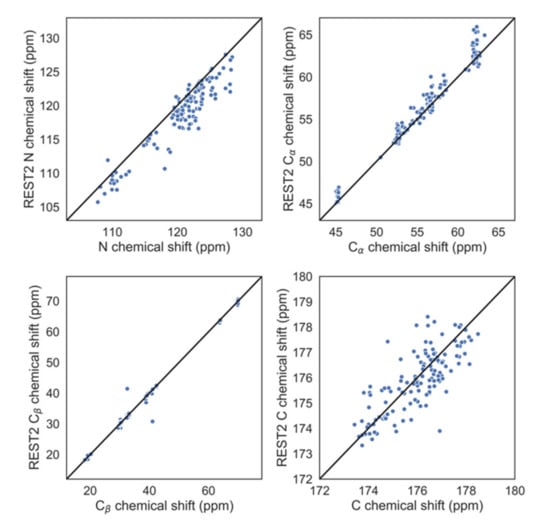 - Han, B.; Liu, Y.; Ginzinger, S.W.; Wishart, D.S. SHIFTX2: Significantly improved protein chemical shift prediction. J. Biomol. NMR 2011, 50, 43–57. [Google Scholar] [CrossRef] [PubMed]