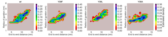 The compactness of the proteins was further investigated through a projection of the radius of gyration (RG) and the end-to-end distance (EE) as reaction coordinates, as performed for other IDP analyses [42]. Figure 5 shows that wt and Y39F shared a similar compactness profile. They populated mostly regions of the conformational space with relatively large RG and EE, therefore having preference for more expanded structures. In contrast, Y39L and Y39A mostly populated regions with progressively lower values of RG and EE (additional information on the minima is reported in Table S1). At the qualitative level, this suggested the following trend in compactness: Y39A > Y39L > Y39F ~ wt, which is consistent with the experimental results (vide supra).