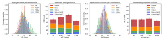 Hydrogen bonds (HB) and hydrophobic contacts (HC) of the four species investigated here. First panel from the left: distribution of HB contacts, with average values of 26.5, 29.6, 32.4, and 29.6 for wt, Y39F, Y39L, and Y39A αS, respectively. Second panel: HB contacts in each protein region. An HB contact was assumed to be present if persistent for 8% of the simulation or longer. Third panel: Distribution of HC contacts, with average values at 53.0, 54.8, 53.8, and 52.7 for wt, Y39F, Y39L, and Y39A αS, respectively. Fourth panel: HC contacts in each protein region. The HC contacts were assumed to be present if persistent for 15% of the simulation or longer. In the second and the fourth panels, error bars are reported. They were computed from the standard deviations of the distributions in the first and the third panels, respectively.