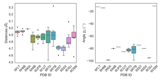 Structural features of fibrillated wt αS proteins. Boxplots showing the distribution of values for ring-to-ring distances (left) and χ2 dihedral angles (right) for fibrillated αS proteins in the PDB for Tyr-39.