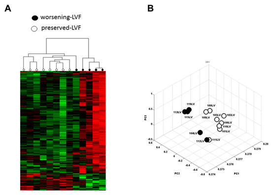 Heatmap and principal component analysis (PCA). (A) Unsupervised hierarchical clustering analysis of the gene expression profiles between worsening-LVF and preserved-LVF. Each row represents an individual sample, and each column represents a specific expressed sequence tag (EST). Bar color indicates gene mRNA expression level. The rows (13) of colored bars (718) represent the significant genes altered by more than 25%, between five worsening-LVF patients and eight preserved-LVF patients. The scale bar represents the intensity of expression (green: low expression, black: medium expression, and red: strong expression). The dendrogram on the top depicts the relationship between individuals. The dendrogram scale was calculated via the distance method (i.e., line length is inversely proportional to relatedness). (B) The PCA plot demonstrates the quality of the array. Each dot represents an expression profile of an individual sample plotted by the PCA score. ● = worsening-LVF; ◯ = preserved-LVF.