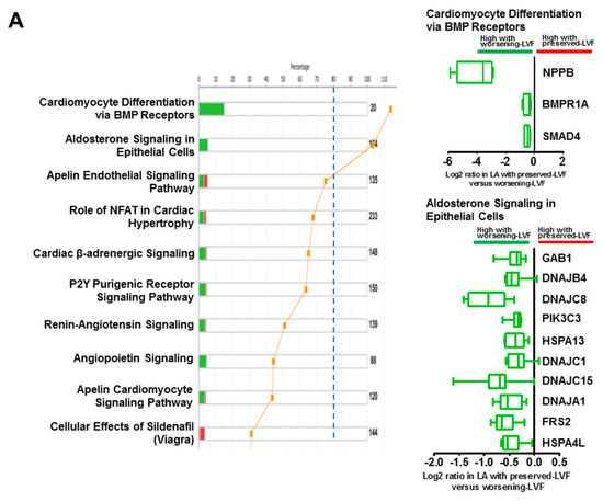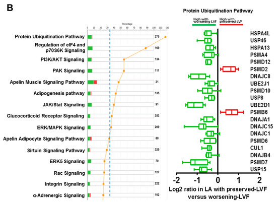 Altered signaling pathways identified byingenuity pathway analysis (IPA). (A) Stacked bar chart (left) shows activated canonical cardiovascular signaling pathways in worsening-LVF. Right panel represents altered genes involved in signaling pathways reaching threshold. (B) Stacked bar chart (left) shows activated canonical intercellular and intracellular signaling pathways in worsening-LVF. Right panel represents 20 genes involved in protein ubiquitination pathway in worsening-LVF. Data are represented as long 2 (worsening-LVF/preserved-LVF) in box-and-whisker plot.