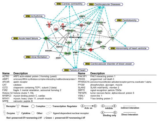 Network analysis for differentially expressed genes between worsening-LVF and preserved-LVF related to cardiovascular dysfunction and cardiac arrhythmia. A glossary for the gene symbols is shown in the lower panel. Red color indicates preserved-LVF > worsening-LVF. Green color indicates preserved LVF < worsening-LVF. Numbers represent fold-change.