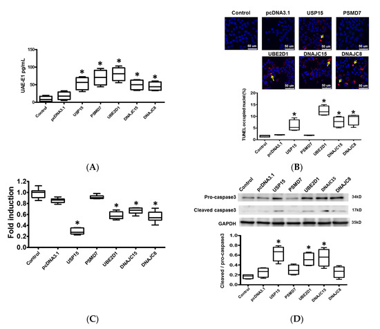 Effects of ubiquitination-related genes on protein ubiquitination and apoptosis in cardiomyocytes. (A) Box-and-whisker analysis of ubiquitin activating enzyme E1 (UAE-E1) expression in HL-1 cardiomyocytes transfected with USP15, PSMD7, UBE2D1, DNAJC15, and DNAJC8 and their pcDNA3.1 control by ELISA. * p < 0.05 versus control. N = 3 to 5 samples for each group. (B) Representative images of cell apoptosis by TUNEL assay. Increased green nuclear fluorescence reflects endo-nucleolytic DNA degradation and apoptosis of HL-1 cardiomyocytes. (C) Box-and-whisker analysis of cell viability by Cell Counting Kit 8 assay. The relative fold-change was normalized to the group of control. * p < 0.05 versus control. N = 3 to 5 samples for each group.(D) Representative blots and box-and-whisker Western blot analysis of pro-caspase 3 and cleaved caspase 3. (E) Representative blots and box-and-whisker Western blot analysis of pro-caspase 9 and cleaved caspase 9. The relative expression levels of proteins corresponding to GAPDH were quantified by densitometry and normalized to control. * p < 0.05 versus control. N = 3 to 5 samples for each gene.