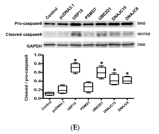 The expression of active/cleaved caspase-9, relative to pro-caspase-9-, was significantly increased, and the expression of XIAP was significantly downregulated in cardiomyocytes transfected with USP15, UBE2D1, DNAJC15, and DNAJC8 compared with pcDNA3.1 control (Figure 4E and Figure 5A). These results suggest that the apoptotic activity was significantly increased by activated UPS.