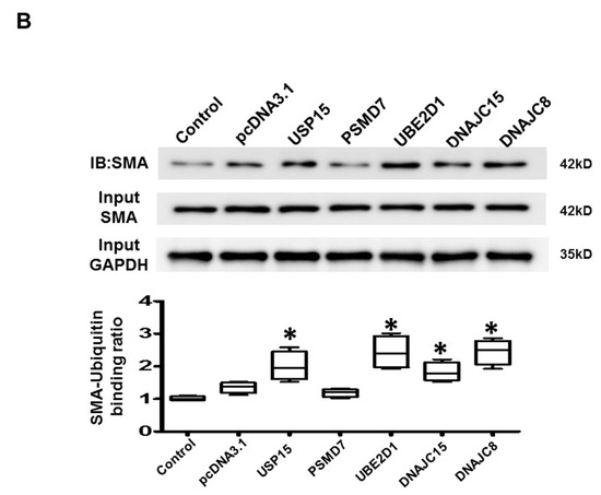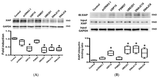 Effects of ubiquitination-related genes on X-linked inhibitor of apoptosis protein (XIAP). (A) Representative blots and box-and-whisker Western blot analysis of XIAP. (B) Representative blots and box-and-whisker Western blot analysis of XIAP immunoprecipitated with ubiquitin. The relative expression levels of proteins corresponding to GAPDH were quantified by densitometry. * p < 0.05 versus control. n = 3 to 5 samples for each experiment.