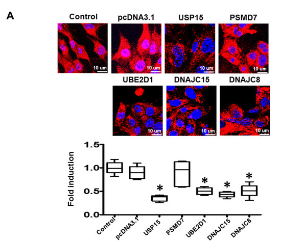 A set of plasmids containing cDNAs of USP15, PSMD7, UBE2D1, DNAJC15, and DNAJC8P were purchased from OriGene (OriGene Technologies, Rockville, MD, USA). The vectors were transfected into HL-1 cardiomyocytes using Lipofectamine 2000 (Thermo Fisher Scientific Inc, Waltham, MA, USA) and used for experiments 24 h after transfection.