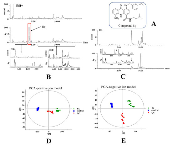 LC-MS based metabolomics study of K562 cells treated with 8q. (A) Chemical structure of 8q; (B) base peak intensity (BPI) chromatograms obtained from control and treated K562 cell extracts in positive ion mode; (C) and negative ion mode; (D) PCA of positive ion mode data; (E) PCA of negative ion mode data.