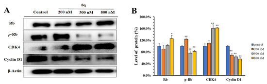 CDK4/6 is a specific protein of the G1 phase that binds with cyclin D to form a complex, promotes phosphorylation of target retinoblastoma-associated protein (Rb), and then allows the cell cycle to enter the S phase [16]. The phosphorylation of Rb is required for the G1-S transition of the cell cycle. Therefore, selective inhibition of Rb phosphorylation can cause the arrest of the cell cycle in G1 phase. As shown in Western blots (Figure 3A,B), 8q (200–800 nM) significantly inhibits CDK 4/6-mediated phosphorylation of Rb, and the expression of Rb protein increased slightly, in a concentration-dependent manner. In addition, the level of cyclin D1 in K562 cells also decreased in a concentration-dependent manner, upon 48 h treatment with 8q. Meanwhile, the level of CDK4 was found to increase dramatically. It may be that 8q affects the formation of CDK4 and cyclin D1 complexes, which is the key step to regulate Rb [17,18]. Accordingly, based on the results of the Western blotting and cell cycle analysis, it is suggested that 8q effectively triggers G1 cell cycle arrest in K562 cells by inhibiting CDK4/6-mediated phosphorylation of Rb.