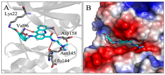 CDK4/6 inhibitors inhibit the progression of cancer cells from G1 to S phase and trigger G1 cell cycle arrest by selectively inhibiting the function of CDK4/6 [19]. After metabolomics and molecular biology studies performed here revealed that the benzyl acridone 8q might be a CDK4/6 inhibitor that down-regulates the phosphorylation level of downstream protein Rb, further studies were designed to evaluate this hypothesis. Therefore, the binding interactions between 8q and CDK4/6 were analyzed in silico by homology modeling and molecular docking. Some CDK4 X-ray crystal structures have been obtained and reported, but all of them are in an inactive state in which the activation loop flaps over and partially closes the active site. CDK6 is a homologous protein of CDK4 with a high percentage of residue identity (71.3%) and similar physiological function. Homology modeling was used to build an active CDK4 structure (Figure S2) according to a reported active CDK6 crystal structure (PDB ID: 2EUF). When docked in the model system, 8q formed several hydrogen (H) bonds with CDK4. It had two H bonds with Val96 in the hinge region, which are conserved H bonds among known CDK4 inhibitors. The nitro group also formed one H bond with Asp158, the methoxy oxygen atom formed one H bond with Lys22, and the N,N-dimethylethylenediamine group formed another two H bonds with Glu144 and Asn145 (Figure 4A). The planar acridone ring was inserted into the active site, with its N,N-dimethylethylenediamine group extending to the negatively charged surface of CDK4 (Figure 4B). The docking result showed that 8q is predicted to have a good complementary interaction with CDK4.