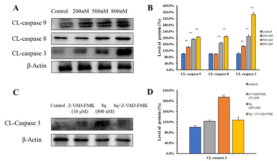 8q induced both mitochondria-mediated and exogenous apoptosis. (A) The expressions of caspase family proteins were determined after 8q treatment; (B) The densitometry of caspase family proteins performed on the Western blotting of A, ** p < 0.01; (C) The expressions of caspase-3 were determined after 8q (800 nM) or Z-VAD-FMK (10 μM) treatment; (D) The densitometry of caspase-3 performed on the western blotting of C, ** p < 0.01.