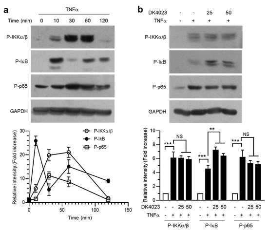 2.6. Effect of DK4023 on the TNFα-Induced Activation of Nuclear Factor-Kappa B (NF-κB) Pathway