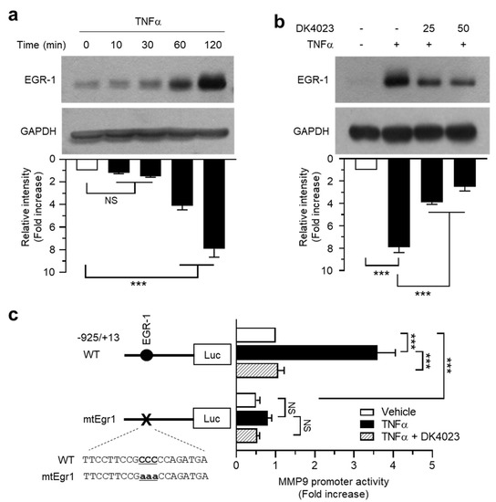 - Shin, S.Y.; Kim, J.H.; Baker, A.; Lim, Y.; Lee, Y.H. Transcription factor Egr-1 is essential for maximal matrix metalloproteinase-9 transcription by tumor necrosis factor alpha. Mol. Cancer Res. 2010, 8, 507–519. [Google Scholar] [CrossRef]