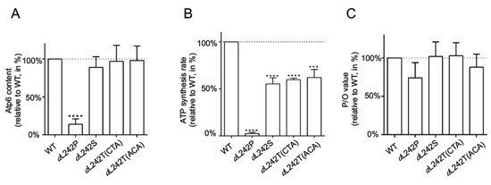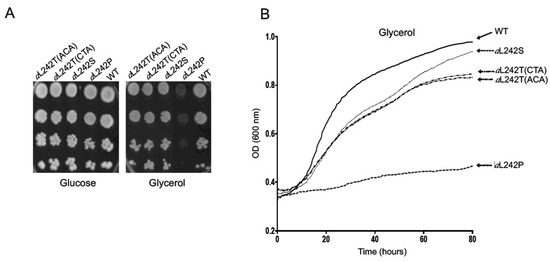 The aL242S and aL242T strains grew well on solid (Figure 1A) and in liquid (Figure 1B) glycerol media, almost as wild type (WT) yeast. This does not imply that ATP synthase assembles and functions normally in these strains, because the rate of mitochondrial ATP synthesis needs to be decreased by at least 80% to see obvious defects in the respiratory growth of yeast [16,18,26]. As reported [18], the aL242P strain has a somewhat higher tendency to produce cells with large deletions in mitochondrial DNA (ρ−/ρo) compared to the WT (15% vs. <1%), which is a phenotype frequently observed in strains with very severe defects in ATP synthase [27,28]. Consistent with their good growth on glycerol and thus certainly with a significant recovery of ATP synthase function (beyond the 20% threshold), the aL242S and aL242T strains had a good genetic stability (<1%) (Table 2).