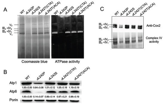 Assembly of OXPHOS complexes. For these experiments mitochondria were isolated from wild type (WT) and the mutant strains aL242P, aL242T and aL242S grown for 24 h at 28 °C in rich galactose liquid media until a density of 2-3 OD600nm. (A) Mitochondria were solubilized with 2 g of digitonin/g protein, and samples of 250 µg were separated by BN-PAGE in a 3–12% acrylamide gel. In the left panel the proteins are stained with Coomassie blue; in the right panel, F1FO complexes are revealed in-gel by their ATPase activity. (B) Total mitochondrial proteins were resolved by SDS-PAGE analysis (50 µg per lane), transferred to a nitrocellulose membrane and probed with antibodies against the indicated proteins. Values are normalized to porin and expressed relative to WT ± standard deviation. (C) Mitochondria were solubilized with 10 g of digitonin/g protein, and samples of 250 µg were separated as in (A) and then transferred to a PVDF membrane. Oligomers of Complex IV associated to complex III (III2-IV2 and III2-IV1) were probed with antibodies against the Cox2 subunit of Complex IV (upper panel) and in-gel by the activity of Complex IV (lower panel). The shown gels are representative of at least 3 experiments.