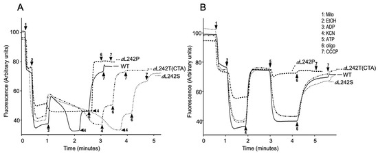 Mitochondrial membrane potential. Variations in mitochondrial ΔΨ were monitored by fluorescence quenching of Rhodamine 123, using intact, osmotically-protected, mitochondria from wild type (WT) and mutant strains aL242P, aL242T and aL242S grown for 24 h at 28 °C in rich galactose liquid media until a density of 2-3 OD600nm (these mitochondrial preparations are the same as those used in Figure 2). The tracings in (A) show how the mitochondria respond to externally added ADP, those in (B) reflect ATP-driven proton-pumping by ATP synthase. The additions were 25 μg/mL Rhodamine 123, 0.15 mg/mL Mito, 10 μL EtOH, 75 μM ADP, 2 mM KCN, 0.2 mM ATP, 4 μg/mL oligo, and 4 μM CCCP. The shown fluorescence tracings are representative of at least three experiments.