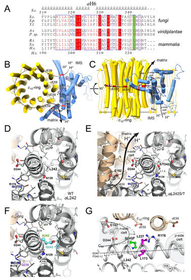 Multiple sequence alignment of ATP synthase a-subunits of various origins was performed using Clustal Omega [53]. Molecular views of subunit a and c10-ring are drawn from the dimeric FO domain of S. cerevisiae ATP synthase (pdb_id: 6b2z; 3.6 Å resolution [6]). All structure figures were drawn using the PyMOL molecular graphic system [54]. The aL242S/T point mutations were introduced using the mutagenesis feature in PyMOL selecting the side-chain rotamer not sterically colliding with neighboring residues. After a 180° rotation of the aAsn129 side chain, the amide nitrogen is in position to hydrogen bond with the hydroxyl groups of aSer242 and aThr242.
