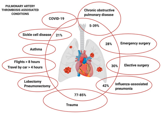 Diseases and conditions with high risk of pulmonary artery thrombosis. Percentages show patients with clots in the lungs and without clots in the deep veins.