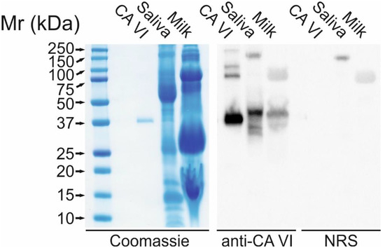 SDS-PAGE and Western blot of purified human CA VI (0.5 ug), saliva (10 uL), and milk (10 uL) using Colloidal Coomassie Blue staining or immunodetection by 1:1000 diluted rabbit anti-human CA VI serum. Normal rabbit serum (NRS, 1:1000 dilution) was used for controls. In SDS-PAGE, the purified CA VI appears as a 40 kDa polypeptide. Western blot shows slightly higher molecular weight bands (42–44 kDa) in both saliva and milk. The slight variation in electrophoretic mobility is probably due to different glycosylation states of the proteins. In addition, the purified CA VI protein shows several higher molecular weight polypeptides in Western blot, which may be attributed to the tendency of CA VI to form oligomeric species.