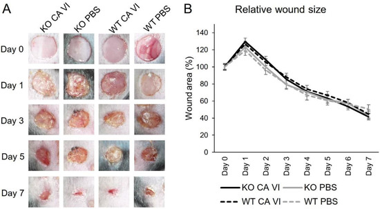 We examined the effects of the lack of endogenous CA VI and exogenously administered human CA VI on murine skin-wound healing. First, we generated CA VI knockout (Car6−/−) mice. These mice are fertile and develop normally [27]. Then highly active CA VI enzyme, in turn, was isolated and purified from human milk essentially as described previously [28,29] (Figure 1). Car6−/− (KO) and wild-type (WT) mice were divided in two groups receiving topically either CA VI or saline (control) in poloxamer 407 gel. The first dose was given right after wounding and the second dose eight hours later. The daily examination of macroscopic wound size revealed no differences between the treatment groups (Figure 2).