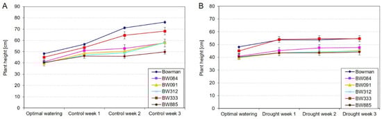 Dynamics of plant growth under the conditions of optimal watering (control) (A) and during exposure to the three-week drought period (B); n = 6 plants per genotype at each time point. The mean values are presented for each genotype, with error bars representing standard deviation. Details are given in the text.