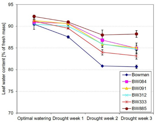 Changes in the leaf water content evoked by exposure of plants to the three-week drought period; n = 12 plants per genotype at each time point. The mean values are presented for each genotype, with error bars representing standard deviation. Details are given in the text.