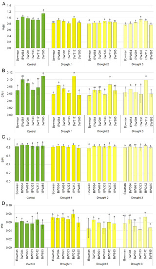 The values of the following parameters in the analyzed genotypes under the optimal watering conditions (control) and during the three-week drought period: WBI (A); CRI1 (B); SIPI (C); and PRI (D). n = 7 replicates per genotype at each time point. The mean values are presented for each genotype, with error bars representing standard deviation. The mean values (±SD) marked with the same letters (separately for the control and drought-stressed plants) are not significantly different, according to the Duncan’s test (p ≤ 0.05). Details are given in the text.