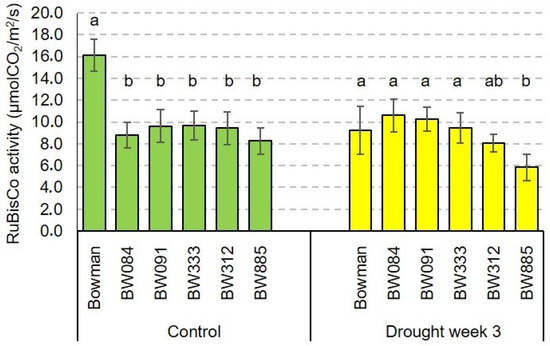 Interestingly, drought resulted in a very significant decline in the RuBisCO activity specifically in the “Bowman” cultivar. In this genotype, the RuBisCO activity under the drought conditions was decreased by 43% when compared with the control value. Generally, the stress did not change the RuBisCO activity significantly in the analyzed NILs. Consequently, in all the analyzed genotypes (“Bowman” and the analyzed NILs), the values of the RuBisCO activity under drought stress were at a similar level (Figure 4).
