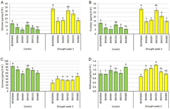 As far as the raffinose accumulation is concerned, content of this trisaccharide was the lowest of all analyzed soluble carbohydrates. Under the control conditions, some differences were reported between the analyzed genotypes; however, no tendency in the variation was determined. Generally, the raffinose contents observed in the NILs were at the level reported in the “Bowman” cultivar or higher (Figure 5D). In contrast to the accumulation profiles of glucose, fructose and sucrose (see above), the drought stress did not lead to a significant change in the raffinose accumulation profiles in the analyzed genotypes. Some changes in the accumulation of raffinose in each of the analyzed genotypes were reported; however, no general tendency of the alterations could be determined (Figure 5D).
