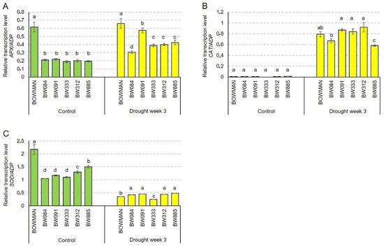 The relative transcription levels of the following genes in the analyzed genotypes under the control and drought conditions: HvAPX (A); HvCAT (B); and HvSOD (C). n = 3 replicates per genotype per growth condition. The mean values are presented for each genotype, with error bars representing standard deviation. The mean values (±SD) marked with the same letters (separately for the control and drought-stressed plants) are not significantly different, according to the Duncan’s test (p ≤ 0.05). Details are given in the text.