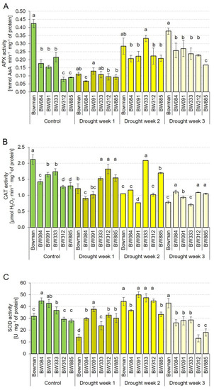 The ascorbate peroxidase activity was determined according to the method published elsewhere [101]. Leaf samples, collected from the second (in the control plants) and third leaves (in the drought-stressed plants), were homogenized at 4 °C with 50 mM phosphate buffer (pH 7.0) containing 1 mM EDTA and 0.5 mM ascorbic acid, and centrifuged at 16,000× g. The reaction mixture containing the phosphate buffer (50 mM, pH 7.0), 0.5 mM ascorbic acid, and supernatant was incubated in the dark for 3 min. Then, 15 mM H2O2 was added. The oxidation of ascorbic acid was monitored in a quartz cuvette at 290 nm. The respective control reaction mixtures contained buffer instead of the H2O2 solution. Activity of the APX enzyme was expressed as μmol AsA oxidized per minute per mg of the protein. The determination of the APX activity under both conditions (control and drought) was performed in three replicates per genotype (three independent samples collected from different plants of each genotype). Each replicate was assayed three times.